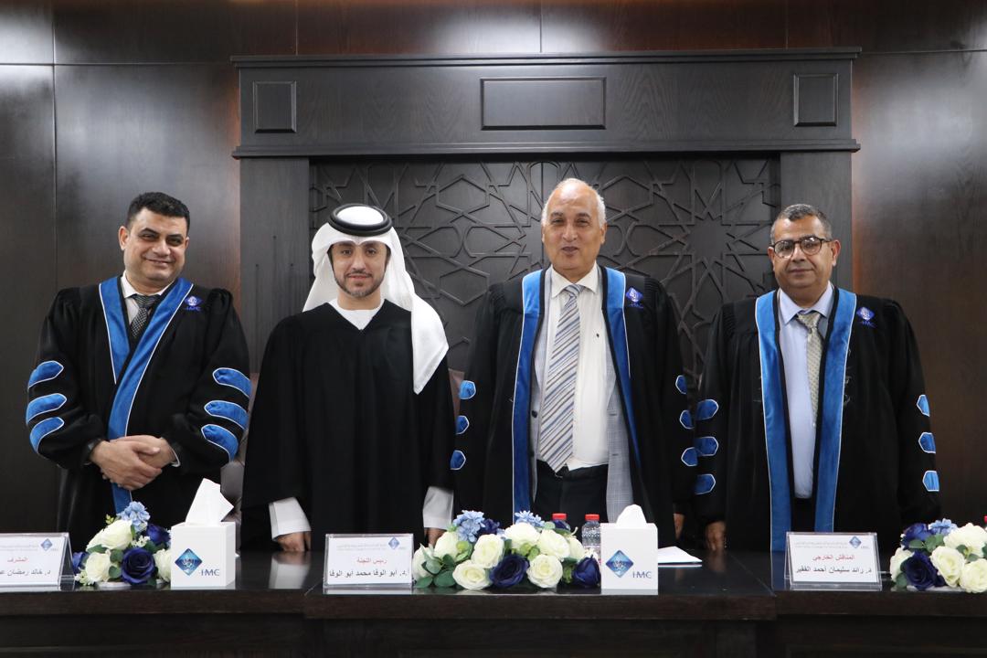 الحماية الجزائية للمعتقدات والشعائر الدينية- دراسة مقارنة، والمشكل لمناقشتها لجنة علمية برئاسة الأستاذ الدكتور أبو الوفا محمد أبو الوفا رئيسًا ومناقشًا خارجيًا، والأستاذ الدكتور خالد رمضان سلطان مشرفًا، والأستاذ الدكتور رائد سليمان أحمد الفقير مناقشًا خارجيًا