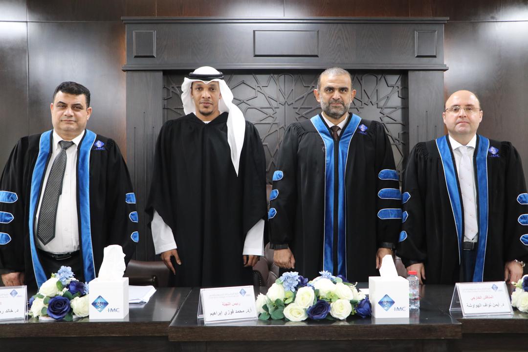 الحماية الجزائية لجريمة انتحال الشخصية عبر مواقع التواصل الاجتماعي- دراسة مقارنة، والمشكل لمناقشتها لجنة علمية برئاسة الأستاذ الدكتور محمد فوزي إبراهيم رئيسًا ومناقشًا خارجيًا، والأستاذ الدكتور خالد رمضان عبد العال مشرفًا، والأستاذ الدكتور أيمن نواف الهواوشة مناقشًا خارجيًا