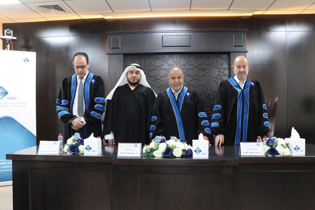 مناقشة رسالة الطالب: كمال إسماعيل كمال إبراهيمي بتخصص الفقه لرسالته للماجستير الموسومة: كتاب " الإيجاز " تأليف تاج الدين محمود بن محمد الكرماني الشافعيَّ الأصفهيدي المُتوفى سنة 807 هـ من أول كتاب البيع إلى نهاية كتاب الخلع" دراسةً وتحقيقا، والمشكل لمناقشتها لجنة برئاسة أ.د علي جمعة الرواحنة رئيساً للجنة، وعضوية أ.د محمد محمود العموش أستاذ الفقه وأصوله في جامعة الشارقة مناقشاً خارجياً، و د. محمد حسن عبدالوهاب مشرفاً.