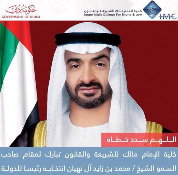 كلية الإمام مالك للشريعة والقانون، تبارك انتخاب صاحب السمو الشيخ محمد بن زايد آل نهيان "حفظه الله" رئيسا لدولة الإمارات العربية المتحدة، متمنين لسموه التوفيق والسداد.