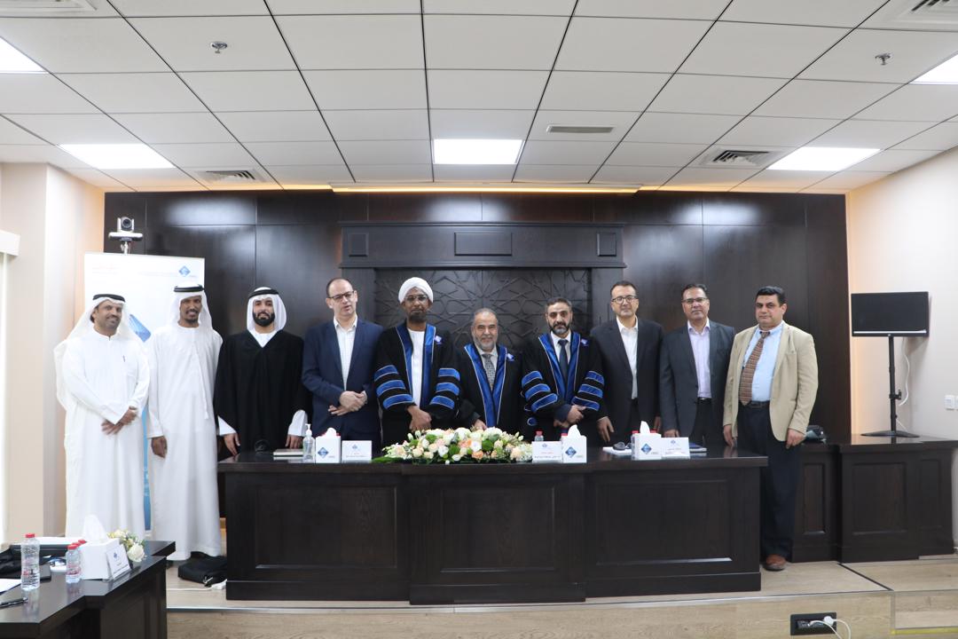 عقدت مناقشة رسالة الماجستير للباحث "منصور مبارك حميد الرقراقي المزروعي" والموسومة: "زيادات واستدراكات أبوعبدالله محمد بن إبراهيم بن خليل التتائي (المتوفى 942 هـ) على رسالة أبو محمد عبدالله بن أبي زيد القيرواني (المتوفى 386 هـ) من خلال شرحه تنوير المقالة في حل ألفاظ الرسالة من بداية باب حكم النكاح الفاسد والمحرمات من النساء إلى باب الجعالة وأحكامها - تخصص الفقه - يوم الخميس الموافق 08/06/2023" حيث تمت المناقشة بقاعة المحكمة الصورية في مقر الكلية بالطابق الخامس وكانت الدعوة عامة لجميع شرائح المجتمع وتم بثها عن بعد عبر قناة الكلية باليوتيوب، وبعد المناقشة نال الطالب درجة جيد جدا مرتفع.