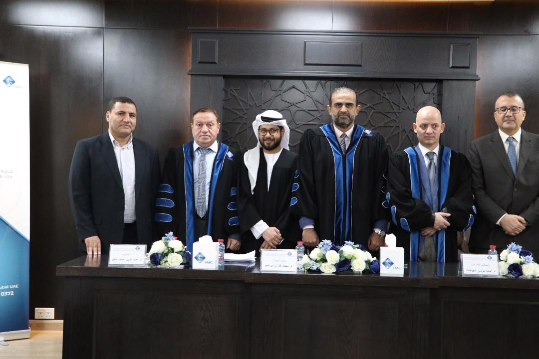 تمت مناقشة رسالة الطالب: حسين علي محمد خميس حمزة بتخصص القانون العام لرسالته للماجستير الموسومة: أحكام الصلح والتسوية في الجرائم والدعاوى الجزائية - دراسة مقارنة، والمشكل لمناقشتها لجنة برئاسة أ.د محمد فوزي إبراهيم أستاذ القانون الجنائي في أكاديمية العلوم الشرطية في الشارقة رئيساً للجنة، وعضوية د.أحمد موسى هياجنة - أستاذ القانون الجنائي المشارك في جامعة الشارقة مناقشاً خارجياً، و د. عماد الدين محمد كامل مشرفاً.